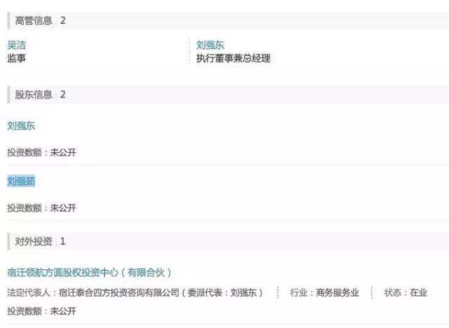 泰合四方投资注册资本1亿元,在两名股东信息中,除了刘强东,另一位名为刘强茹,不过,该公司并未披露股东的出资信息。
