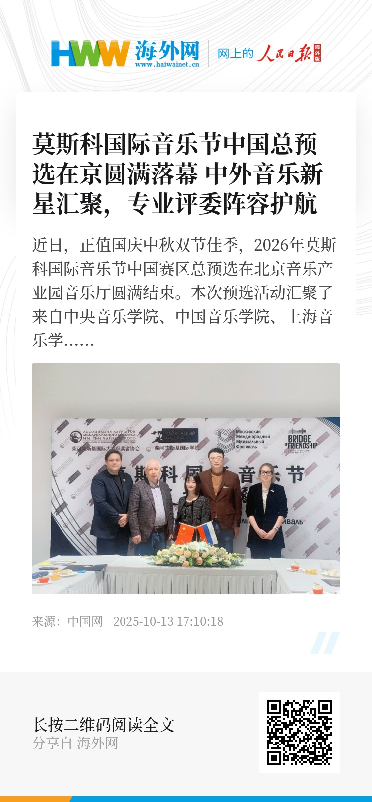 近日,正值国庆中秋双节佳季,2026年莫斯科国际音乐节中国赛区总预选在北京音乐产业园音乐厅圆满结束。本次预选活动汇聚了来自中央音乐学院、中国音乐学院、上海音乐学院、沈阳音乐学院等国内顶尖音乐院校的优秀选手,展现了我国青年音乐人才的高水平技艺与艺术风采。