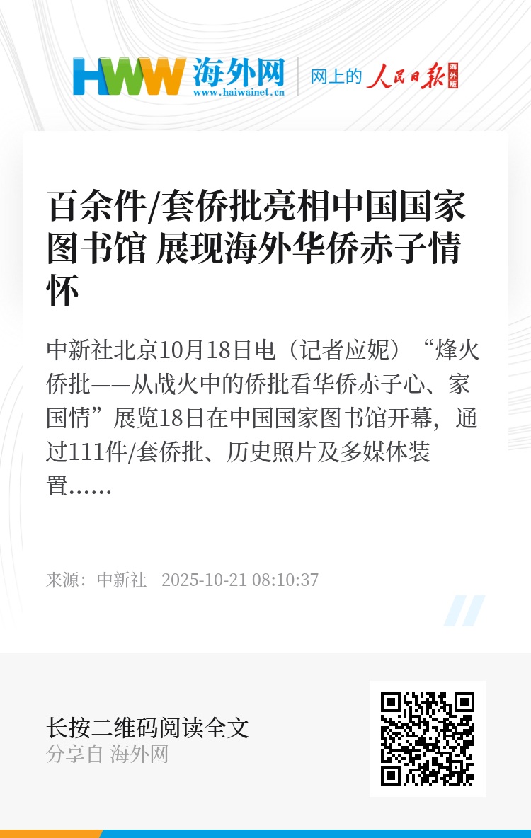 中新社北京10月18日电(记者应妮)“烽火侨批——从战火中的侨批看华侨赤子心、家国情”展览18日在中国国家图书馆开幕,通过111件/套侨批、历史照片及多媒体装置,展现华侨“爱国、爱乡、爱家人”的赤子情怀。