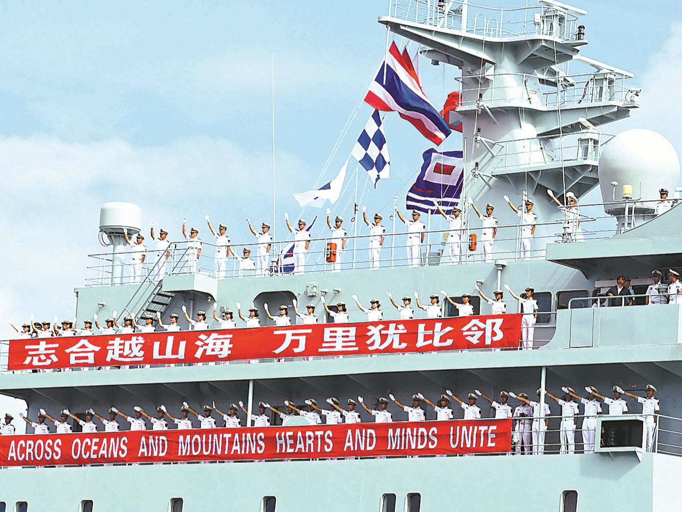 戚继光舰官兵在泰国梭桃邑港向民众致意。新华社发