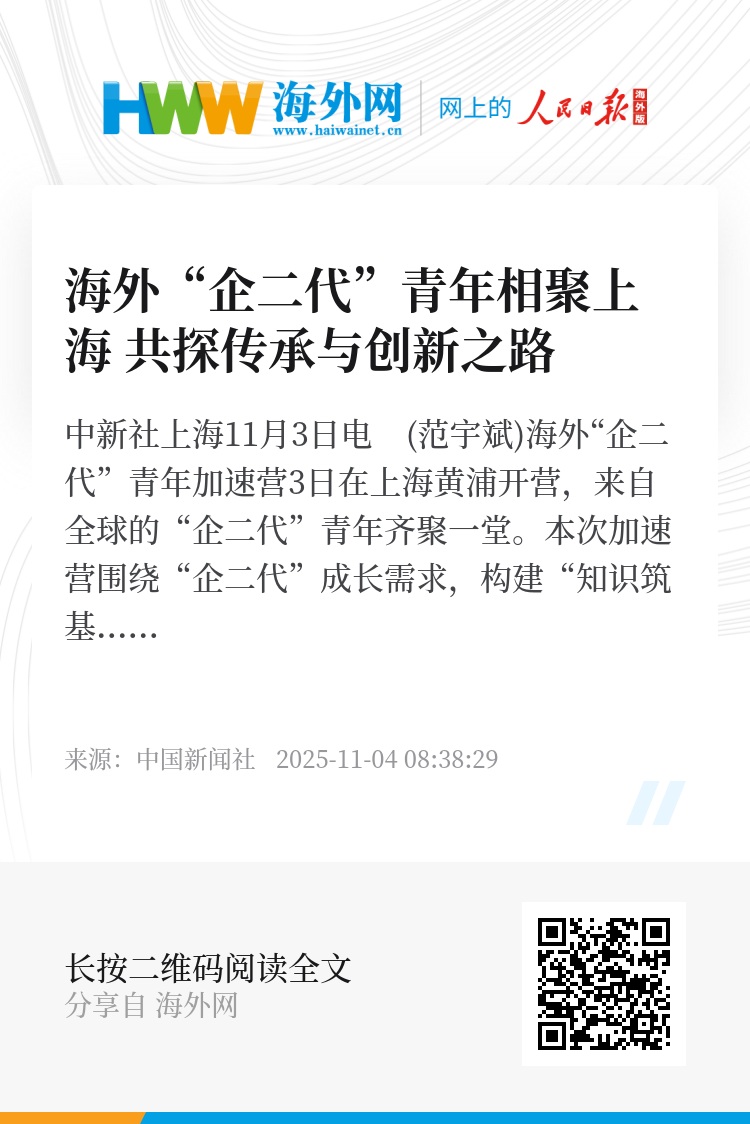 中新社上海11月3日电 (范宇斌)海外“企二代”青年加速营3日在上海黄浦开营,来自全球的“企二代”青年齐聚一堂。