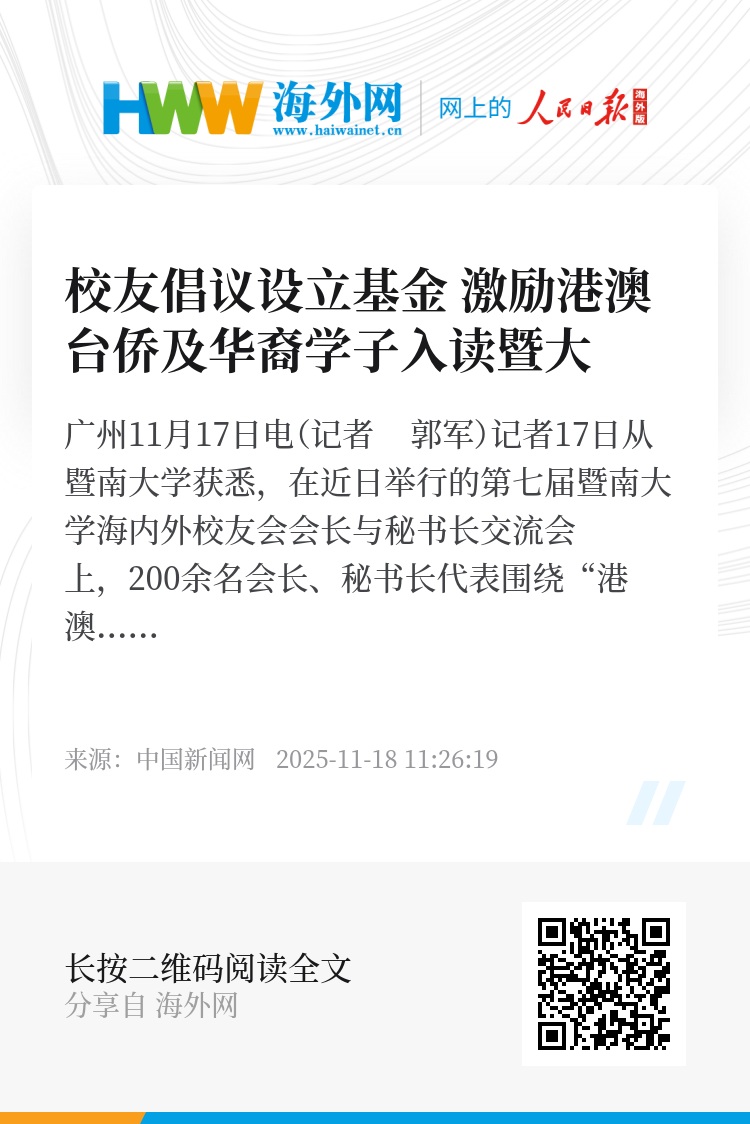 中新网广州11月17日电(记者 郭军)记者17日从暨南大学获悉,在近日举行的第七届暨南大学海内外校友会会长与秘书长交流会上,200余名会长、秘书长代表围绕“港澳台侨及华裔学生培养”主题展开深度探讨,并一致通过倡议:为迎接2026年暨南大学建校120周年华诞,设立“暨南大学薪火伙伴传承基金”,该基金将作为激励港澳台侨及华裔学子入读暨大的新生奖学金。
