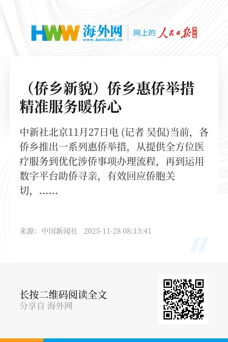 中新社北京11月27日电 (记者 吴侃)当前,各侨乡推出一系列惠侨举措,从提供全方位医疗服务到优化涉侨事项办理流程,再到运用数字平台助侨寻亲,有效回应侨胞关切,带来切实便利。