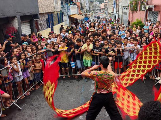 现场,舞狮表演、机器人互动、儿童游戏区充满欢声笑语,现场秩序井然。来自巴西弘恩双语学校的小学生带来舞蹈表演,并将自己准备的玩具送给社区孩子。随后的幸运抽奖环节将气氛推向高潮。12辆全新自行车依次被抽出,获得自行车的孩子们抱着奖品在台前合影,周围响起阵阵掌声。其余到场儿童也陆续领取了圣诞礼物,工作人员逐一核对名单,确保人人都有收获。