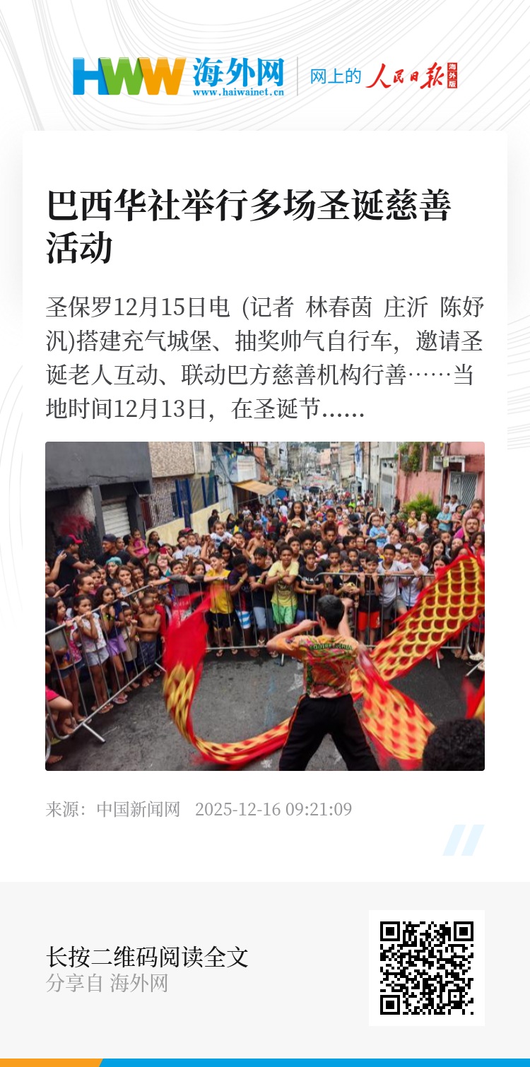 中新网圣保罗12月15日电 (记者 林春茵 庄沂 陈妤汎)搭建充气城堡、抽奖帅气自行车,邀请圣诞老人互动、联动巴方慈善机构行善……当地时间12月13日,在圣诞节临近之际,巴西圣保罗和里约热内卢华社走进当地低收入社区,举行多场圣诞慈善活动。