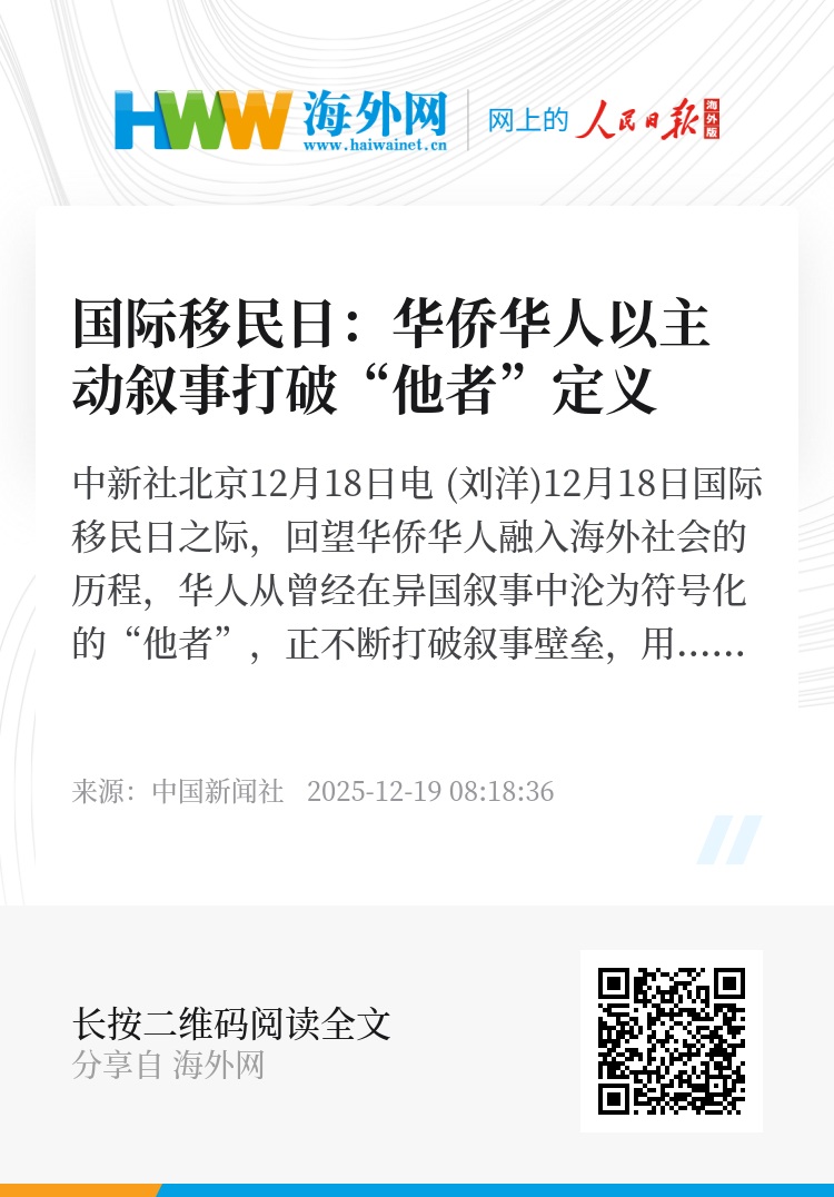 中新社北京12月18日电 (刘洋)12月18日国际移民日之际,回望华侨华人融入海外社会的历程,华人从曾经在异国叙事中沦为符号化的“他者”,正不断打破叙事壁垒,用自己的声音重写真实的华人形象。