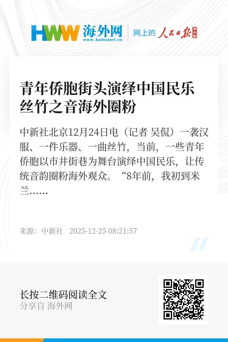 中新社北京12月24日电(记者 吴侃)一袭汉服、一件乐器、一曲丝竹,当前,一些青年侨胞以市井街巷为舞台演绎中国民乐,让传统音韵圈粉海外观众。