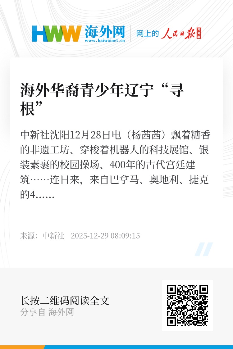 中新社沈阳12月28日电(杨茜茜)飘着糖香的非遗工坊、穿梭着机器人的科技展馆、银装素裹的校园操场、400年的古代宫廷建筑……连日来,来自巴拿马、奥地利、捷克的40名华裔青少年齐聚沈阳,参与2025“亲情中华·中国寻根之旅”冬令营辽宁沈阳营活动。营员们在花式过冬的独特体验中,共同经历了一段中华文化的体验之旅、互动交流的友谊之旅。