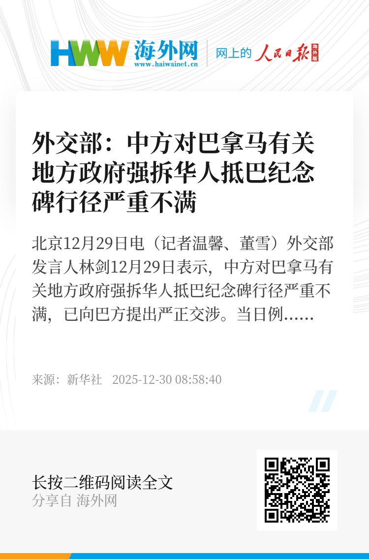 新华社北京12月29日电(记者温馨、董雪)外交部发言人林剑12月29日表示,中方对巴拿马有关地方政府强拆华人抵巴纪念碑行径严重不满,已向巴方提出严正交涉。