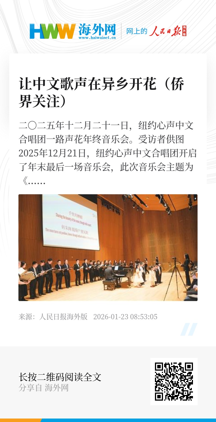 2025年12月21日,纽约心声中文合唱团开启了年末最后一场音乐会,此次音乐会主题为《一路声花》,由各阶段的花期作为隐喻,演唱了多首中文歌曲,为新的一年传递期盼。