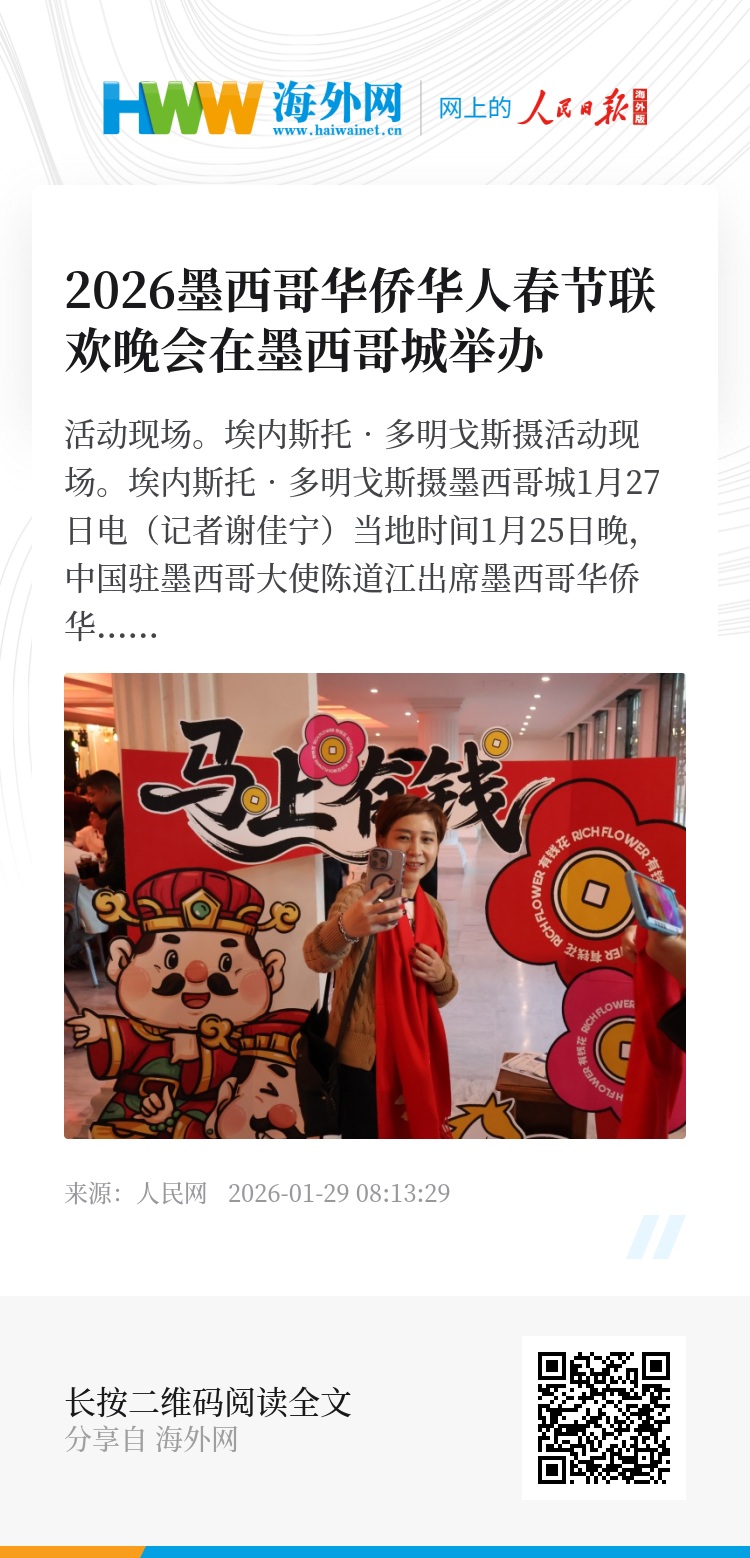 陈道江向旅墨侨胞致以新春祝福,并围绕“新蓝图、新篇章、新担当”阐述中国发展与中墨合作前景,勉励侨胞做文化互鉴的“播种者”、经贸创新的“探路者”与和谐侨社的“引领者”,以龙马精神共迎丙午马年。
