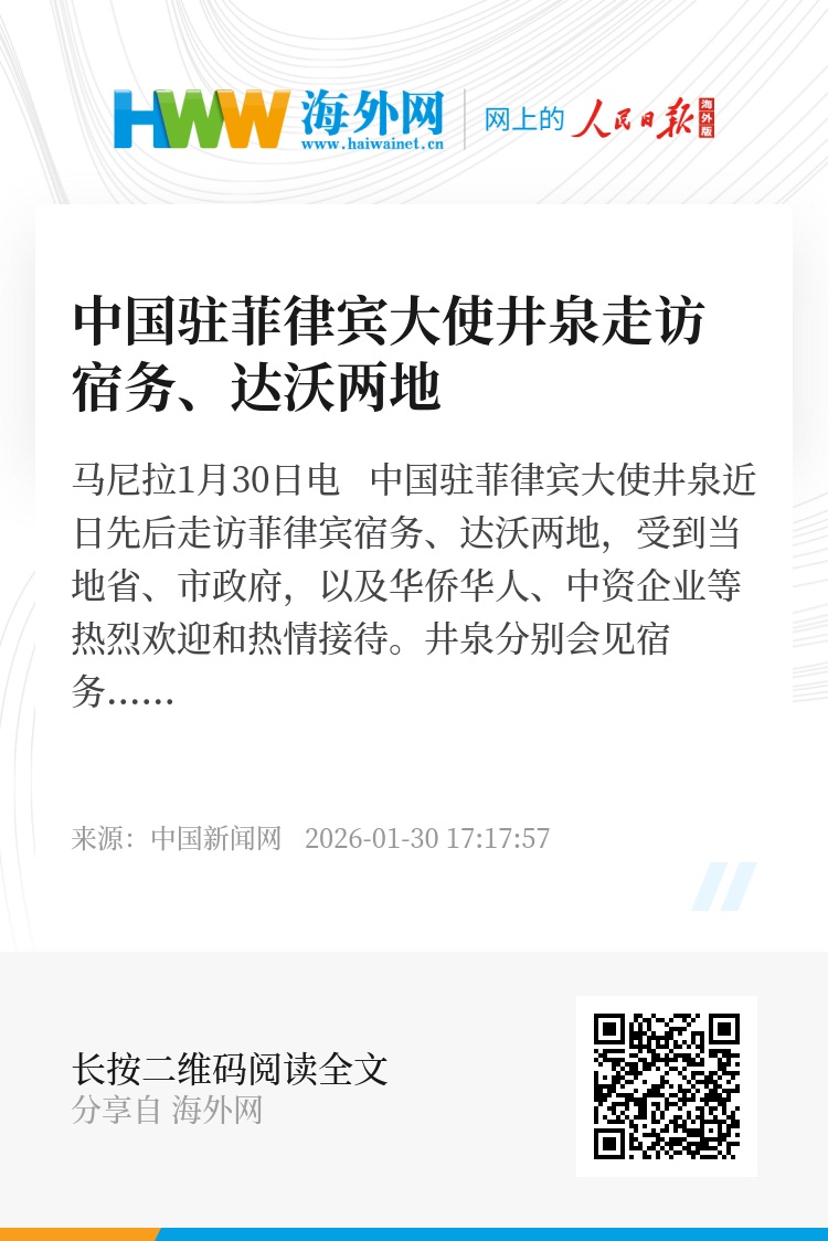 中新网马尼拉1月30日电 中国驻菲律宾大使井泉近日先后走访菲律宾宿务、达沃两地,受到当地省、市政府,以及华侨华人、中资企业等热烈欢迎和热情接待。
