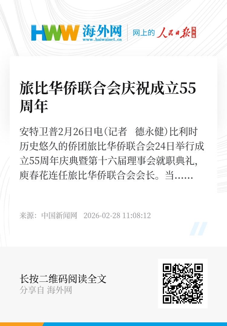 中新网安特卫普2月26日电(记者 德永健)比利时历史悠久的侨团旅比华侨联合会24日举行成立55周年庆典暨第十六届理事会就职典礼,庾春花连任旅比华侨联合会会长。